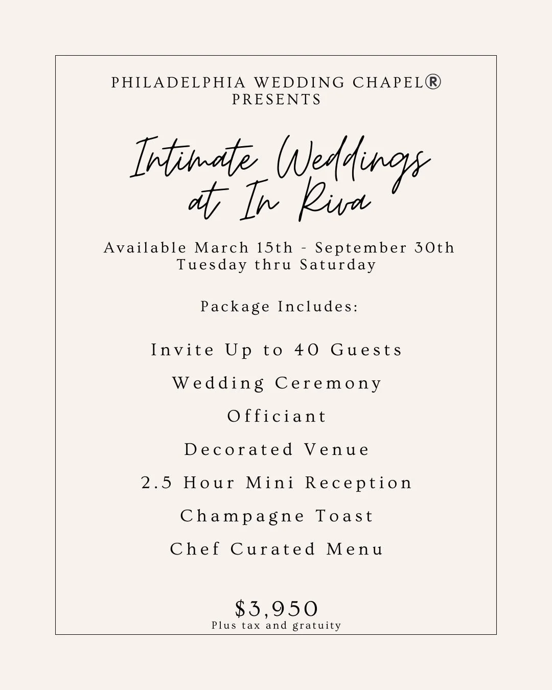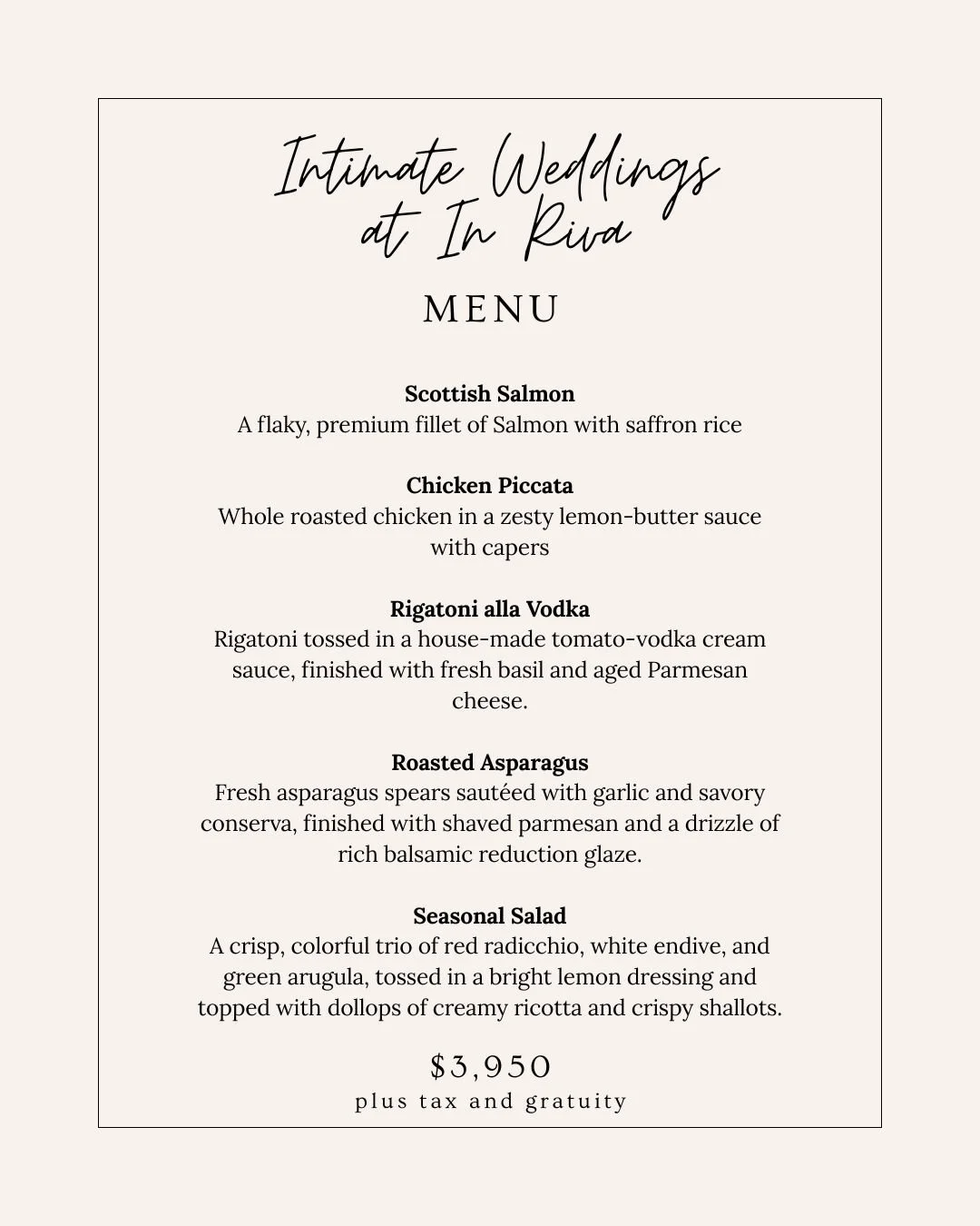 We are thrilled to announce our partnership and collaboration with In Riva Restaurant East Falls to now offer a new all-inclusive service. Beautifully curated intimate wedding celebrations in their newly renovated upstairs event space. Designed for gatherings of up to 40 guests, this all-inclusive experience allows couples to exchange vows in a fully decorated ceremony setting before celebrating with a 2.5-hour mini reception overlooking the river. The package includes a wedding officiant, decorated ceremony and reception space, a chef-curated menu and a champagne toast…creating a seamless and memorable celebration for you and your closest family and friends.